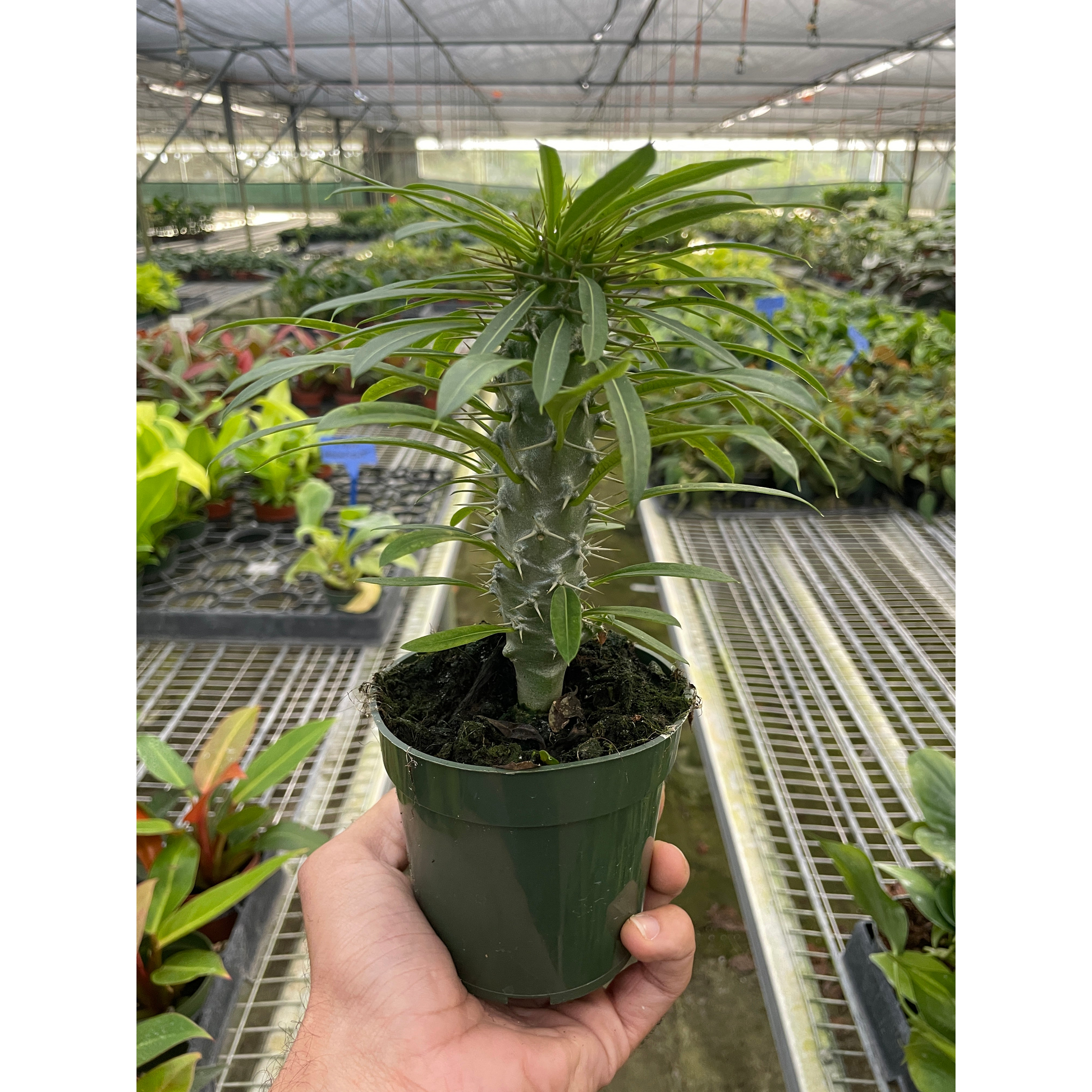 The swollen stem grows upwards with the leaves surrounding the crown gradually falling and then growing new ones as it ages. All parts of Pachypodium contain a latex sap which is poisonous. However, even if you do have pets this may not be a total deal breaker because the plant protects itself by way of tough hooked spines that will deter even the most curious cat.